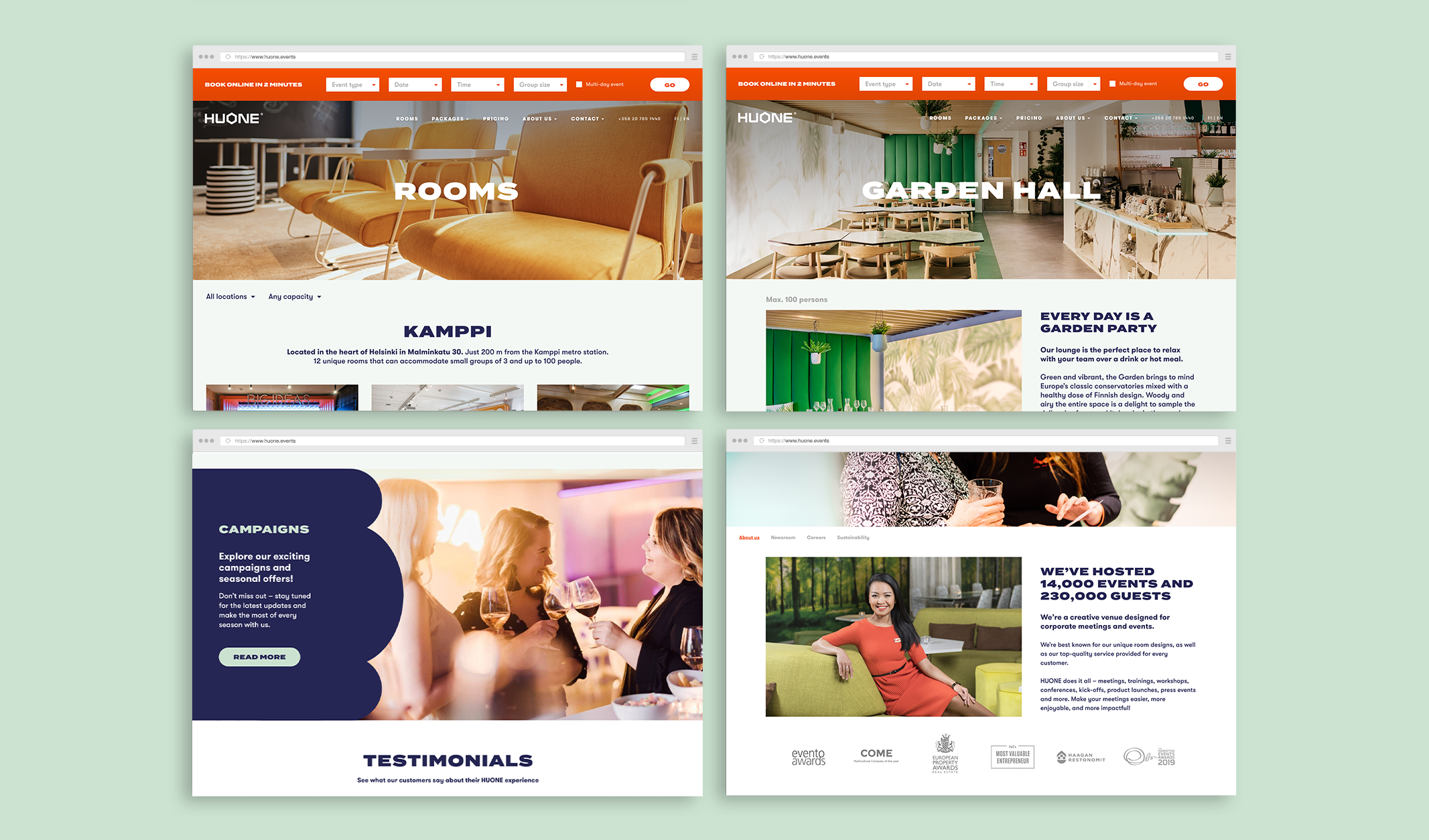 Olemme tehneet yhteistyötä HUONEen kanssa vuodesta 2014 asti ja auttaneet sinä aikana kehittämään sivustoa sekä varausjärjestelmää ja toteuttamaan jo useamman laajan verkkosivu-uudistuksen. Jokaisessa sivustossa ja palvelussa on aina parannettavaa, eikä ylivertaista lopputulosta saavuteta ilman aktiivista kehitystyötä. Viimeisin kehitystyö valmistuu syksyllä 2023 ja sen tavoitteena on visuaalisen ilmeen modernisoinnin lisäksi kehittää erityisesti käyttäjäpolkuja ja mobiilinäkymiä, jotta palveluvalikoima on houkuttelevammin esillä ja online-varausjärjestelmä aiempaa käyttäjäystävällisempi.