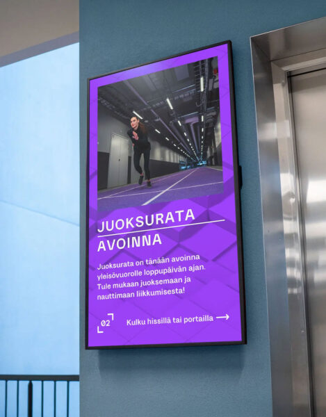 Brändin mukaisesti olemme suunnitelleet Hypelle esimerkiksi talon opasteita, teippauksia, diginäyttöjen sisältöjä, paitoja ja muita brändituotteita, esitteitä ja catering-menuja. Luonnollisesti brändi näkyy vahvasti myös verkkosivuilla ja markkinoinnissa.