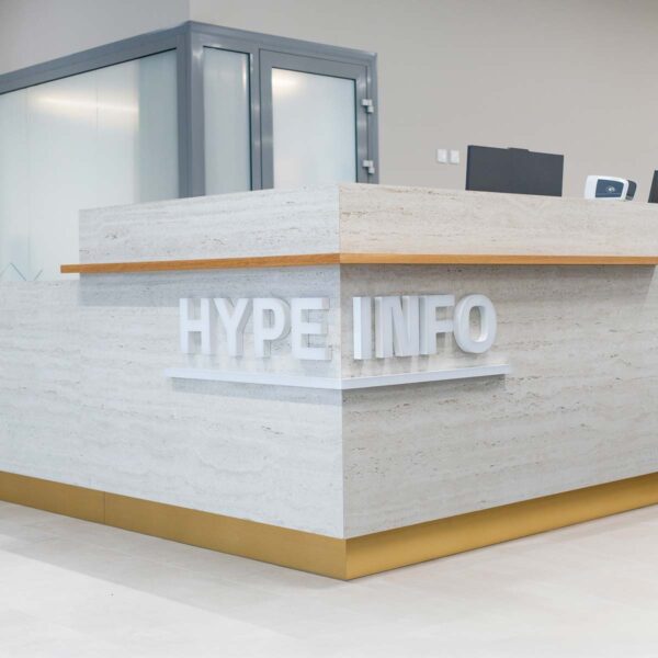 Olemme olleet merkittävässä roolissa toteuttamassa Hypen ilmettä myös talon sisällä. Suunnittelemamme opasteet ja teippaukset ovat olennainen osa rakennuksen tunnelmaa. Brändin mukaisesti toteutetut kerroskyltit, motivoivat tsemppilauseet ja pleksien kuvioinnit luovat yhtenäisen ja raikkaan kokonaisuuden, joka huokuu urheilullista energiaa.