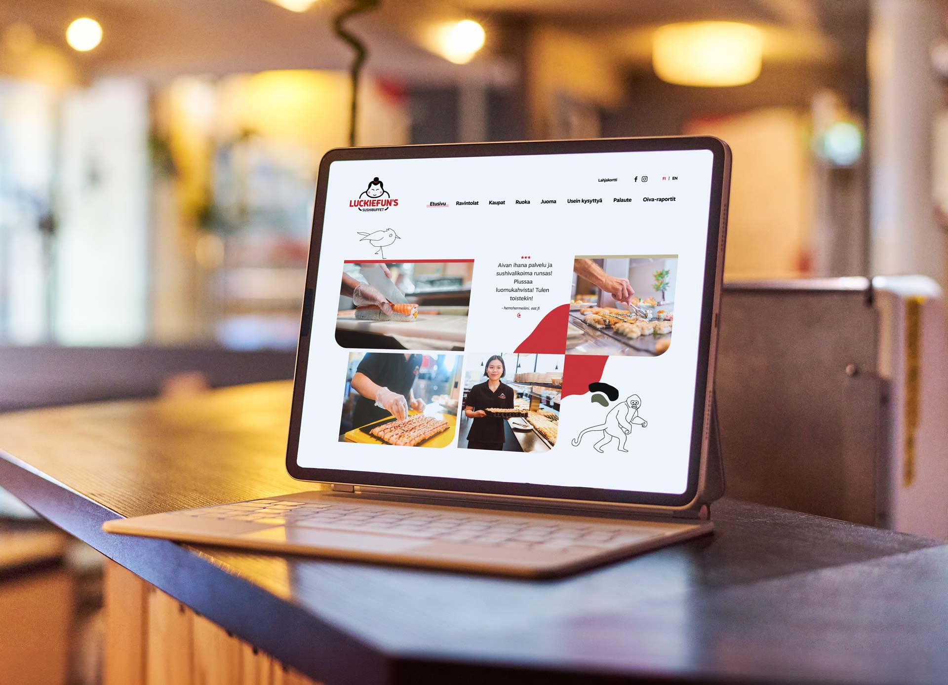 Luckiefun’s on Suomen suosituin sushiravintolaketju, joka tarvitsi vahvan ja yhtenäisen brändin. Jalkautuksessa tuli huomioida käyttäjäystävällisen verkkosivuston lisäksi myös muun muassa ravintoloiden sisustus, pakkaukset ja sosiaalinen media.